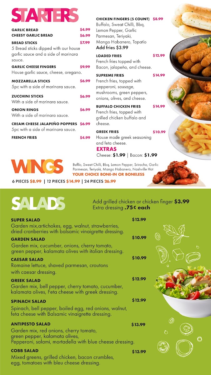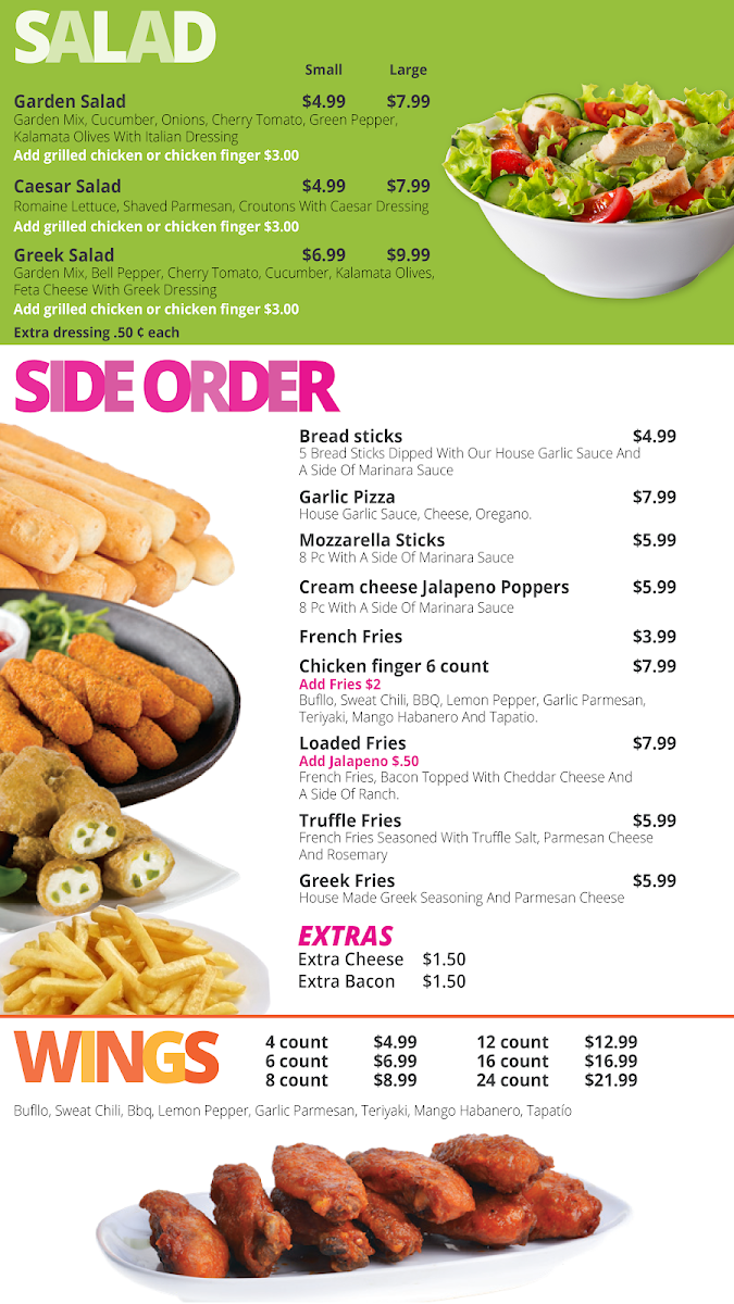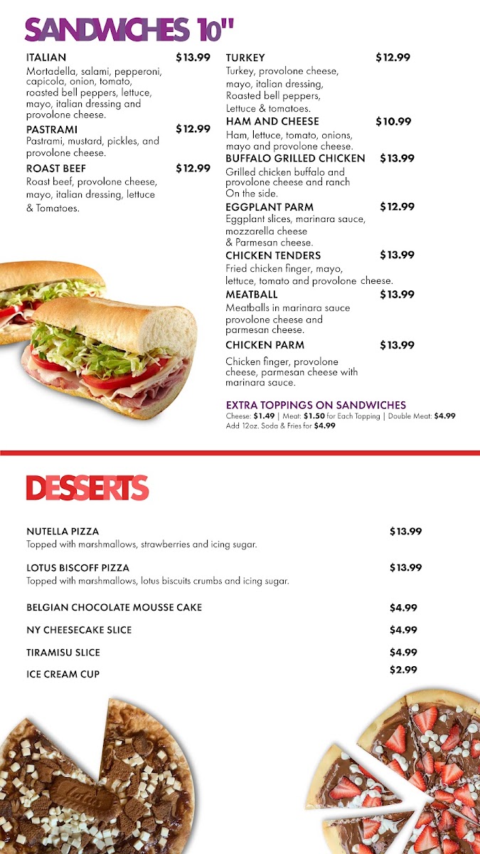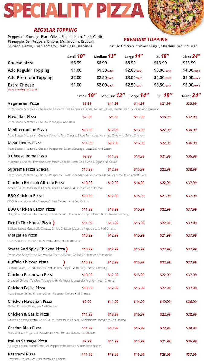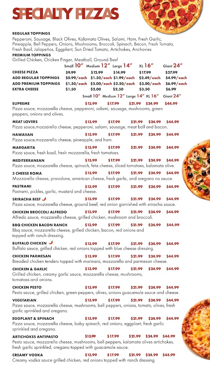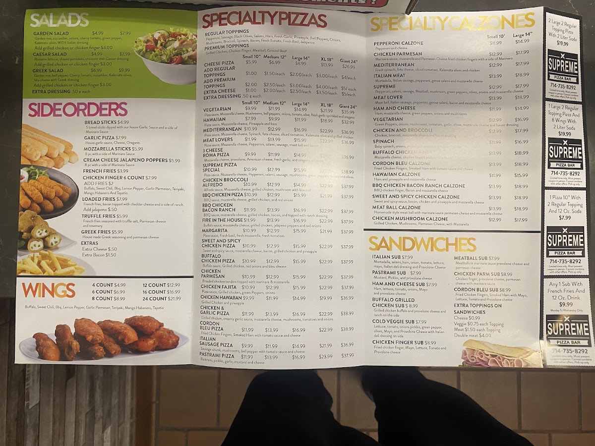Supreme Pizza at 12447 Valley View St offers a menu that balances classic favorites with inventive options. For those planning gatherings, the Catering section features crowd-pleasers like 50 Pc Chicken Wings, Zucchini Sticks, 50 Pc Chicken Tenders, Meatball And Sauce, and Greek Salad. Pizza lovers can choose from Specialty Pizzas such as BBQ Chicken Pizza and Pepperoni Pizza, or create their own on a 10'' Small, 14'' Large, or even a 24'' Giant crust. Pasta options are hearty and varied, including Rose’ Pasta, Bolognese Pasta, Chicken Parm Pasta, Pesto Delight Pasta, and Vegetarian Pasta. The sandwich lineup boasts generous 10'' subs like Pastrami Sub, Italian Sub, Buffalo Chicken Sub, Eggplant Parm Sub, and Chicken Finger Sub. For a creative twist, the Specialty Calzones include Spinach Calzone, Supreme Calzone, Meat Lover Calzone, Chicken Mushroom Calzone, and Chicken Parmesan Calzone. Fresh salads like Greek Salad, Garden Salad, Antipasto Salad, Spinach Salad, and Ceasar Salad complement the mains. Side orders add extra indulgence with Supreme Fries, Zucchini Sticks, Cream Cheese Jalapeno Poppers, Garlic Cheese Fingers, and Onion Rings. Sweet finishes range from Lotus Biscoff Pizza 10'' and Nutella Pizza 10'' to Belgian Chocolate Mousse Slice, NY Cheesecake Slice, and Haagen Dazs Ice Cream Cup 3.6 Oz. A selection of beverages, including Gatorade, Water Bottle, 2 Litter Soda, 12 OZ Can, and Monster Drink, rounds out the menu. Overall, Supreme Pizza provides a menu that is both comprehensive and approachable, appealing to pizza aficionados, pasta lovers, and dessert seekers alike.